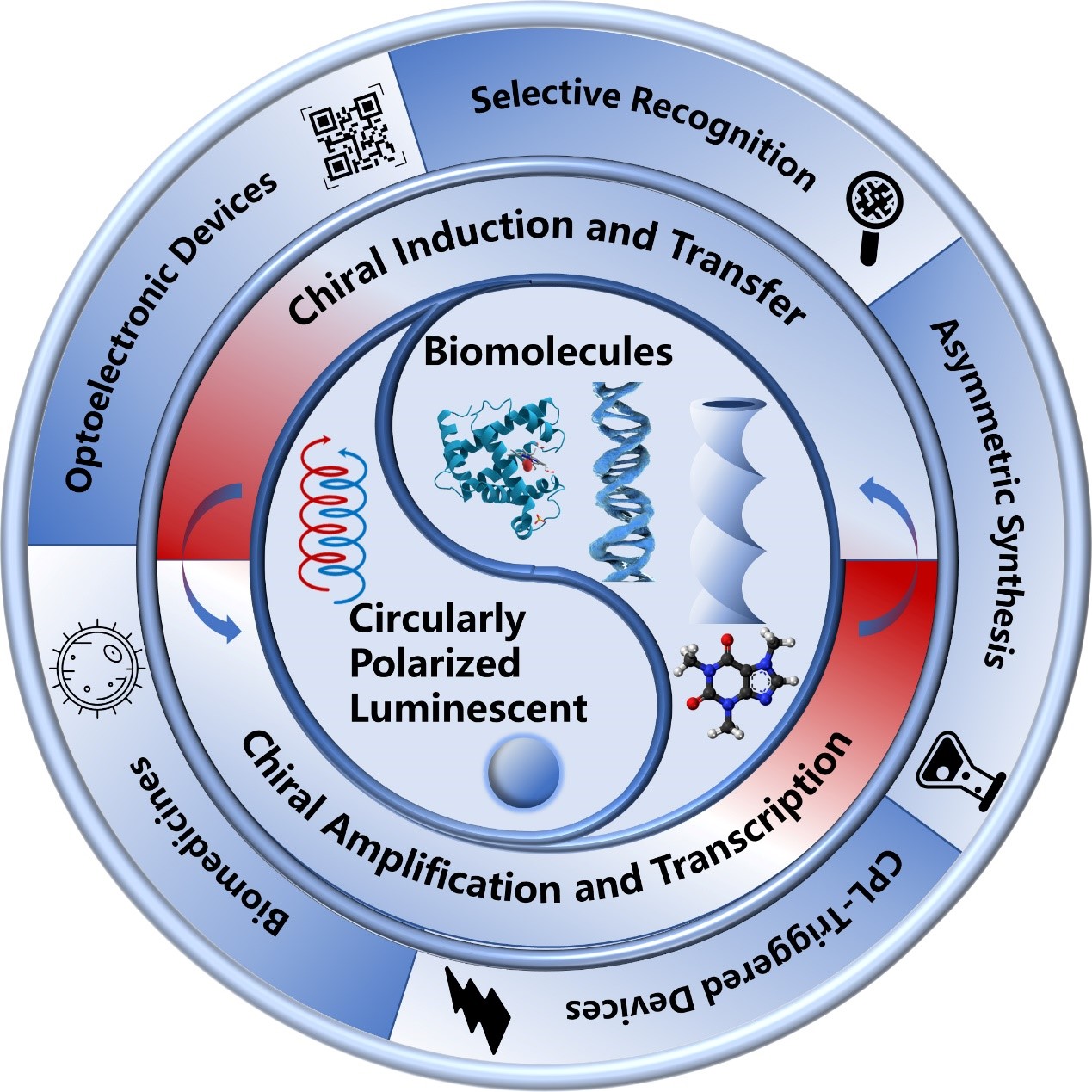 圆偏振荧光(CPL)材料在信息加密、光电器件、三维光学显示、生物医学等领域有着广阔的应用前景,近年来备受关注。常见的制备策略通过共价修饰、掺杂、超分子共组装等方法实现非手性发光单元的螺旋,通常采用手性化合物、无机材料和聚合物材料等为模板。生物分子体系由于其序列结构、可变构型、可编码性和生物相容性等特性,引起了研究人员的极大兴趣。然而目前关于基于生物分子的CPL材料设计及其应用方面的总结和讨论仍属空白。