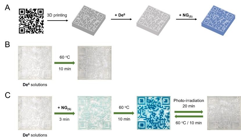 自然界已经提供了良好的例子来调控水溶液中的可逆光异构化,然而,疏水染料在水溶液中的可逆光异构化调控一直是一个巨大的挑战。本团队通过温敏树枝化纳米凝胶构筑的受限微环境,增强斯坦豪斯加合物(DASA)在水溶液中的有效可逆异构化调控。这些具有温度响应性的树枝化纳米凝胶含有树枝化寡聚乙二醇(OEG),并通过相应的树枝化大单体在相变温度以上交联聚合而成。纳米凝胶中DASA异构化的调控既取决于DASA的亲水性,也取决于纳米凝胶的物理形貌,这决定了纳米凝胶中链间协同作用的有效性。树枝化纳米凝胶表现出“海绵”一样能有效富集和包络水溶液中的DASA,同时促进它们从亲水环状结构部分转变为疏水性的线型结构。由于温敏脱水、坍缩增强的疏水性和纳米凝胶内树枝化OEG的拥挤堆积,这种异构化能够在相变温度以上得到极大增强,可用来实现可见光驱动水溶液中的信息加密。将打印的QR码通过交替加热到相变温度以上和可见光照射,实现了可逆写入和擦除。近期本团队将传统DASA染料分子进行树枝化改性,使其携带不同端基和不同的支化密度形成不同的拥挤效应(Science China Chemistry, 2024, 67, 1636–1646),进一步制备树枝化DASAs共聚物增强水溶液中的异构化调控(Molecules, 29, 5055),这些为控制被封装客体分子在水溶液中的物理化学状态提供了有效方法,为通过树枝化分子拥挤效应实现目标物质或分子的功能和性质方面的调控创造了全新路径。